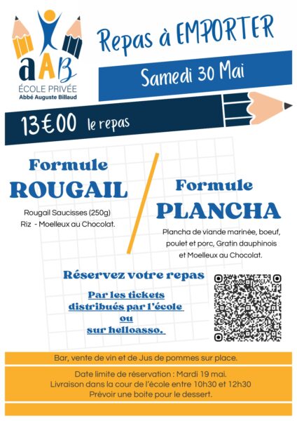 Vous avez la possibilité de commander via HelloAsso https://www.helloasso.com/associations/ogec-de-l-ecole-abbe-auguste-billaud/boutiques/repas-a-emporter-ecole-abbe-billaud-30-mai-2026